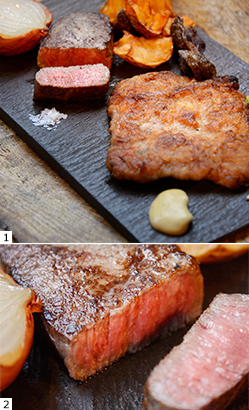1 前菜からデザートまで、オールマイティにこなす鈴木料理長が、なかでも得意とする肉料理を堪能できる「本日の肉尽くし」(写真の200g ¥2,500のほか、300g ¥3,200も用意)。宮崎産・尾崎牛のランプステーキと平たく成形したオリジナルの自家製サルシッチャにローストにした淡路島直送の玉ねぎ、地元・立川産のじゃがいものフリットを添えて(野菜の産地は時期によって異なる)。 2 西東京エリアで提供している飲食店はここくらいという尾崎牛。“幻の牛”と言われる希少な牛が入るのも、食材にこだわり、生産者との繋がりを大切にするこの店ならではだ。